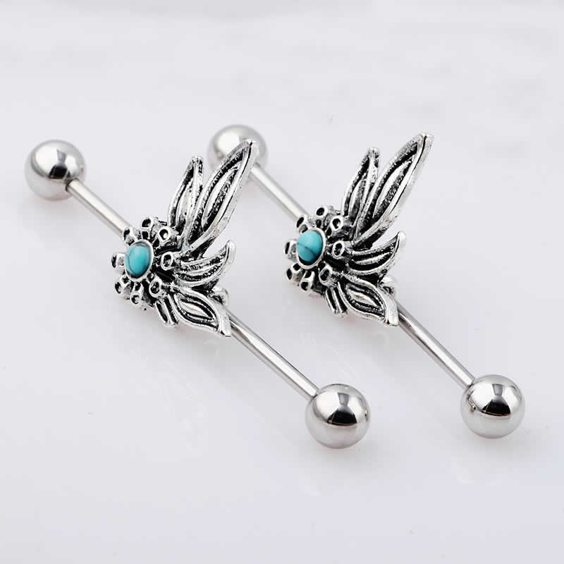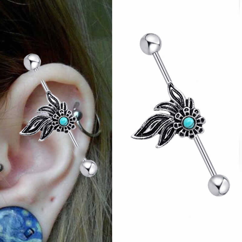 炎をモチーフにしたデザインの真中にトルコ石をセットしたボヘミアンスタイルの14ゲージのインダストリアルバーベル。